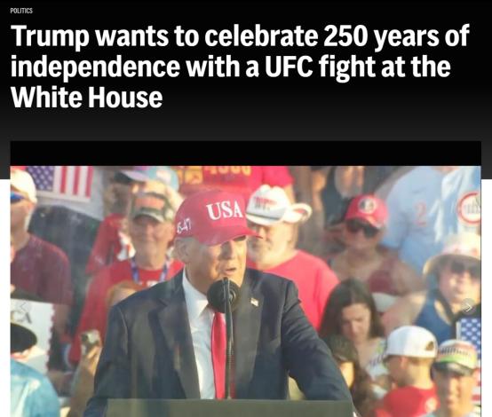 当地时间3日,美国总统特朗普宣布计划于2026年在白宫举办一场终极格斗冠军赛(英文缩写UFC),以庆祝美国独立250周年。